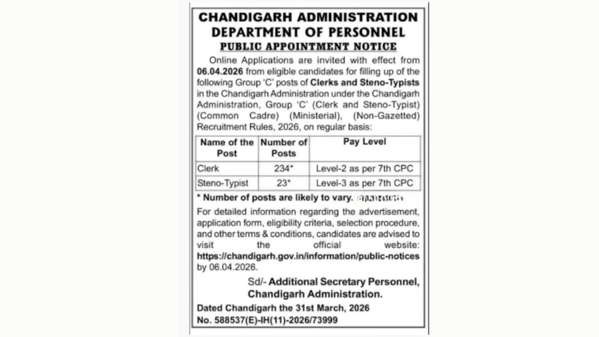 Chandigarh Administration ne Clerk aur Steno-Typist posts ke liye recruitment notification jari kiya hai. Total 257 Group C vacancies hain. Online application 06 April 2026 se shuru honge. Interested candidates official website chandigarh.gov.in par apply kar sakte hain.